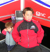 今回のレースに関しては、「表彰台の1番高い所を目指して走ったのは当然だけど、1ヒート、2ヒート共に4位と言う結果は、状態現在の状況下で考えれば、納得がいく」と話してくれました。木曜日までは天気がよかったのに、金曜日から雨。天候に恵まれず、満足の行くテストが出来なかった状態での日曜日(決勝)。1ヒート目はウエットレース。レースは17周で成立。(最後まで走っていたら、タイム的にも、間違いなく3位に食い込めたはず!)2ヒート目もウエット(雨)状態でスタート、だったんですが!!!他のライダーが前後ウエットをセレクトする中、P.