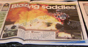 この時、BSB(イギリススーパーバイク選手権)にテストを兼ねて参戦した紀ちゃん(所属するチーム・Renegadeの本拠地がイギリスなので。。。)レースはBSB参戦中の加賀山就臣さんがダブルウインを決めたのに!も関わらず・・・次の日の新聞は『NITROに火がついた!』っと、紀ちゃんが飾りました。レースに賭ける情熱が、ようやく形になりました。。。