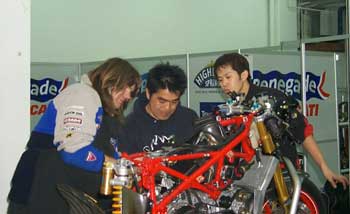 ※写真はアンディー(チームメイト・ハスラム選手のメカ)、松本エンジニア(数々のライダーを優勝に導いた超大物優勝請負人)、石井メカ(秘密兵器)。